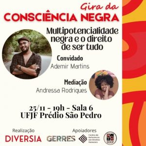 A atividade, organizada pelo Laboratório de Estudos sobre Diferença, Diversidade e Desigualdades (Diversia), será mediada pela estudante do curso de Direito da UFJF-GV, Andressa Rodrigues. O convidado é o comunicador e produtor cultural, Ademir Martins.