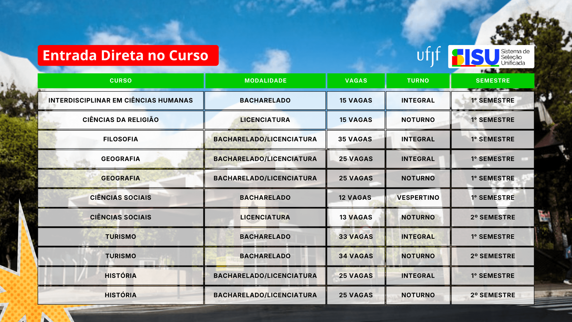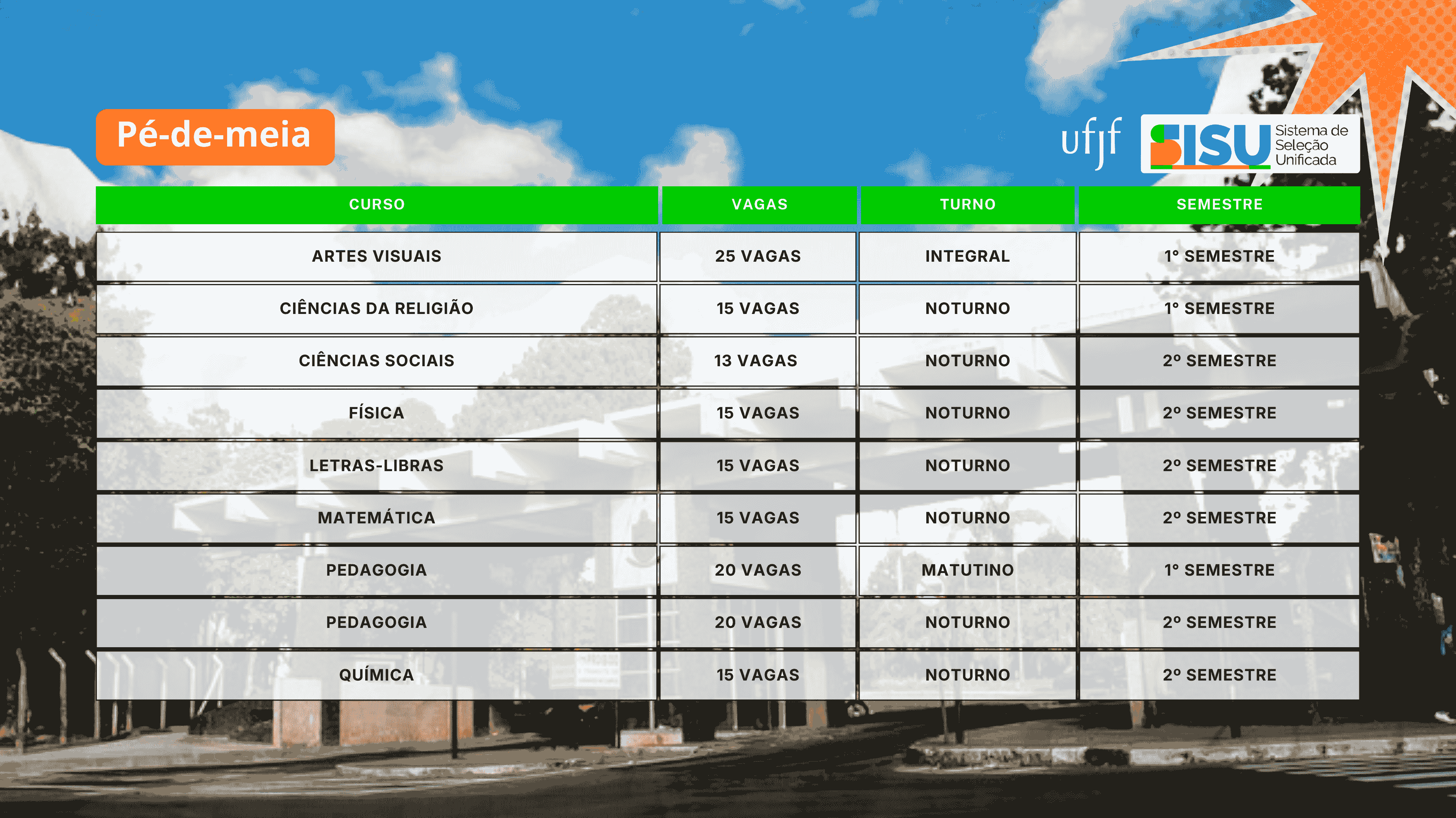 No Sisu 2026, oito cursos de Licenciatura da UFJF participam do Pé-de-Meia. Confira abaixo: