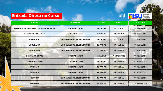 Outra novidade do Sisu 2026 na UFJF é a ampliação do ingresso direto em cursos do Instituto de Ciências Humanas (ICH). A partir desta edição, a UFJF passa a oferecer entrada direta nos cursos de Ciências da Religião, Filosofia, Geografia, Ciências Sociais, Turismo e História.