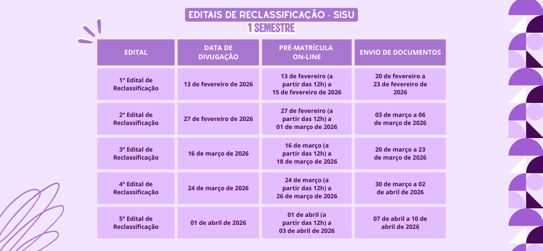 Em seguida, devem acompanhar as chamadas dos editais de reclassificação. A Universidade também divulga listas de antecipação de ingresso, com nomes de classificados para o segundo semestre mas que terão sua entrada antecipada, começando as aulas ainda no primeiro semestre.
