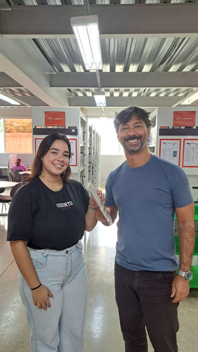 Nycoli Gomes, estudante de odontologia e bolsista do projeto “Fomentando arte e cultura na UFJF-GV – ano II”; e Welerson Gregório Macieira, bibliotecário da UFJF-GV; (Foto: arquivo biblioteca)