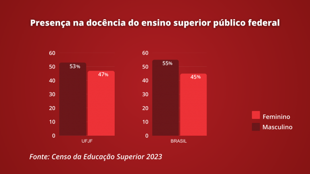 Apesar de todos esses avanços, quando se analisa o perfil do quadro docente nas instituições federais de ensino superior, essa tendência não se confirma. De acordo com o último Censo da Educação Superior, 55% do quadro de professores são homens, contra 45% de mulheres em todo o Brasil. Em uma análise dos dados da Universidade Federal de Juiz de Fora (UFJF), a diferença é um pouco menor, mas ainda distante da equidade: são 53,4% de homens contra 46,6% de mulheres.