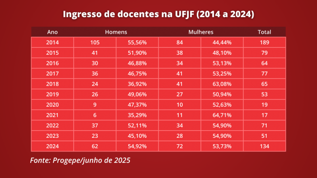 No entanto, essa tendência vem apresentando mudanças na UFJF. Entre 2014 e 2024, o número de docentes mulheres que ingressaram na instituição para postos efetivos foi maior que o de homens. Foram 420 mulheres (51,28%) contra 399 homens (48,72%). Os dados foram sistematizados na pesquisa de doutorado “Desigualdades de gênero e raça na universidade pública: trajetórias, silêncios e resistências na carreira docente da UFJF”, defendida em novembro de 2025 pela jornalista e doutora em Ciências Sociais Flávia Lopes.