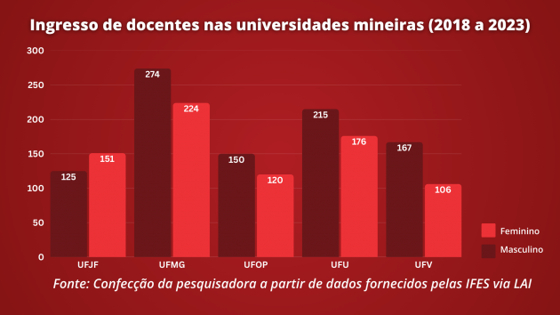Conforme a pesquisa, no mesmo período, foram registrados 62.378 ingressos no país, sendo 34.448 de homens (55,21%) e 27.930 de mulheres (44,78%). Das cinco instituições analisadas pela pesquisa entre 2018 e 2023 (UFMG, Ufu, Ufop, UFV, além da UFJF), apenas a UFJF apresentou uma proporção maior de contratação de mulheres no período (veja o gráfico acima). A maior discrepância entre os gêneros foi observada na UFV: de um total de 273, foram contratadas 38,83% mulheres e 61,17% homens. Na UFMG, que reuniu o maior volume de contratações entre as mineiras analisadas, de um total de 498 contratações, 45% foram mulheres e 55% homens.