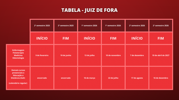 Os cursos presenciais dos campi de Juiz de Fora e as graduações na modalidade Educação a Distância (EaD seguem o calendário acadêmico regular da UFJF.