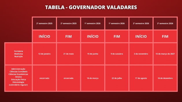 No campus avançado de Governador Valadares, os cursos de Farmácia, Medicina e Nutrição também funcionam com calendário específico.