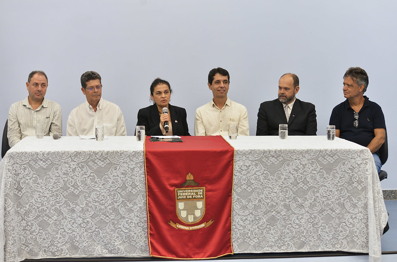 (Da esquerda para a direita) ex-vice-reitor Clécio Ferreira, o diretor do ICE, Wilson Melo; a reitora da UFJF, Girlene Alves; o vice-reitor, Telmo Ronzani; o ex-diretor Eduardo Barrére; e o vice-diretor do ICE, Raul Neto (Foto: Twin Alvarenga)