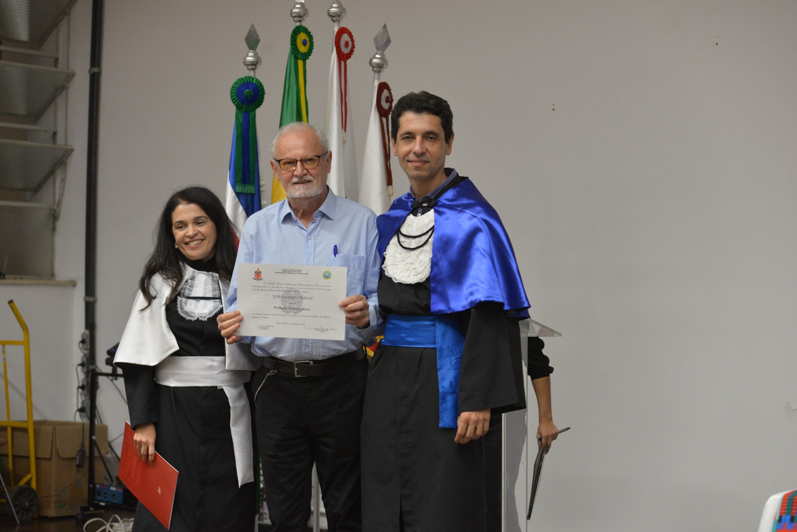 Tìtulo Honoris Causa foi entre a Steletes pela reitora da UFJF, Girlene Alves, e o vice-reitor, Telmo Ronzani (Foto: Twin Alvarenga/UFJF)