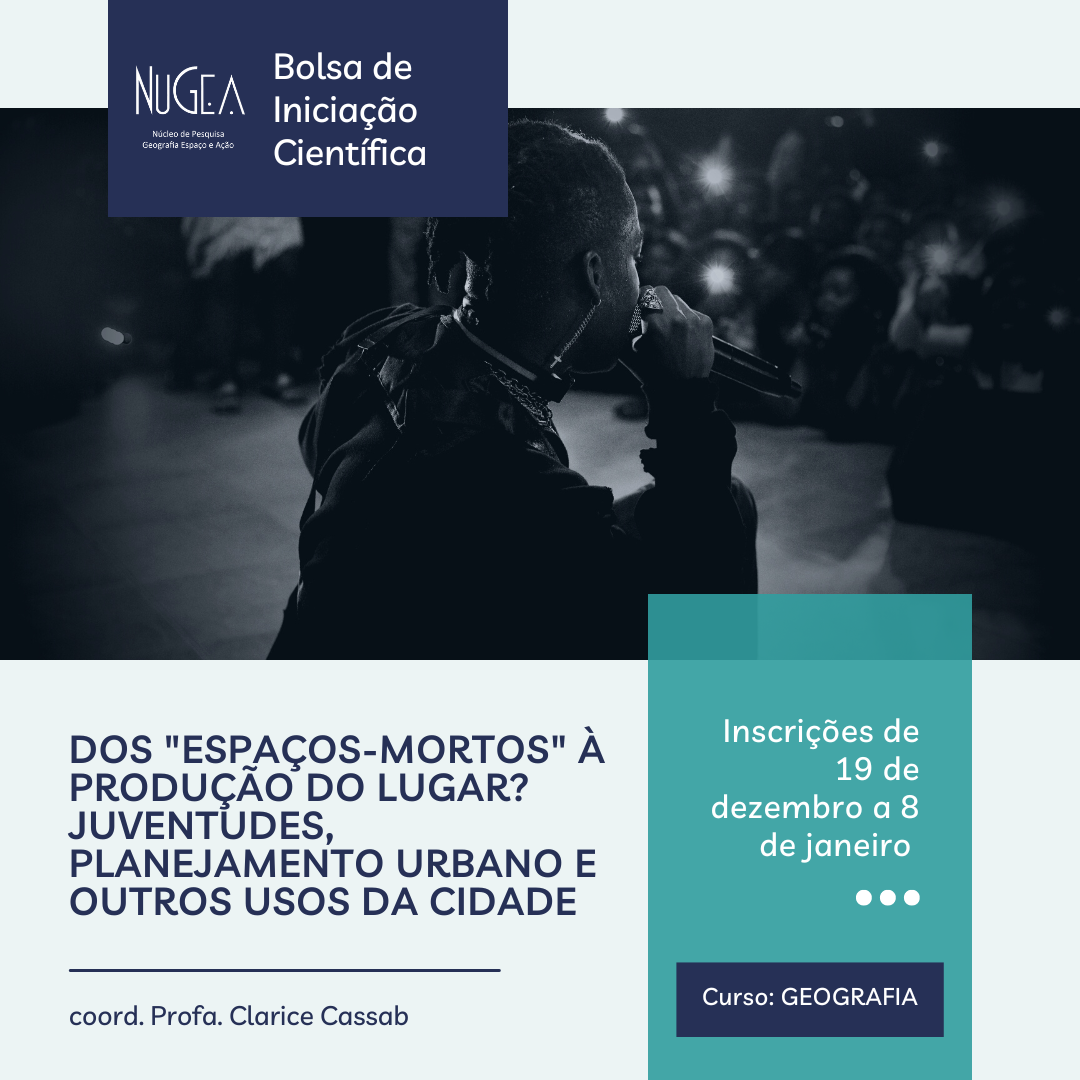 Entre os dias 19 de dezembro e 08 de dezembro estará aberta a inscrição para bolsa de iniciação científica FAPEMIG. A bolsa, no valor de R$600, é para atuar no projeto Dos “espaço-mortos” à produção do lugar? Juventudes, planejamento urbano e outros usos da cidade, coordenado pela profa. Clarice Cassab.