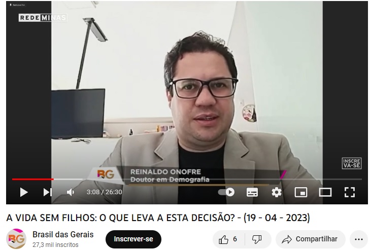 Reinaldo dos Santos, prof. do DEGEO e pesquisador do NuGea participou do programa ‘Brasil das Gerais”, da Rede Minas, com o tema “A vida sem filhos: o que leva a está decisão?” Na ocasião abordou o cenário demográfico atual e os condicionantes para a queda da Fecundidade.