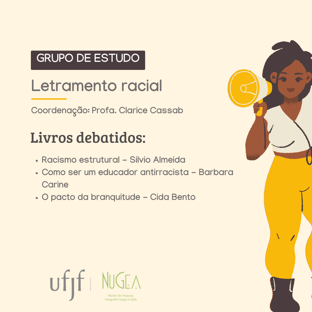 Sob a coordenação da profa. Clarice Cassab, o NuGea abriu o Grupo de estudo em letramento racial, reunindo, além dos bolsistas dos projetos coordenados pela professora, discentes de outros cursos. Mensalmente o grupo se encontra para o estudo de uma obra ligada a temática racial. Iniciado esse ano os participantes pretendem ler três obras: 1) Racismo estrutural (Silvio Almeida), 2) Como ser um educador antirracista (Bárbara Carine) e 3) Pacto da branquitude (Cida Bento).