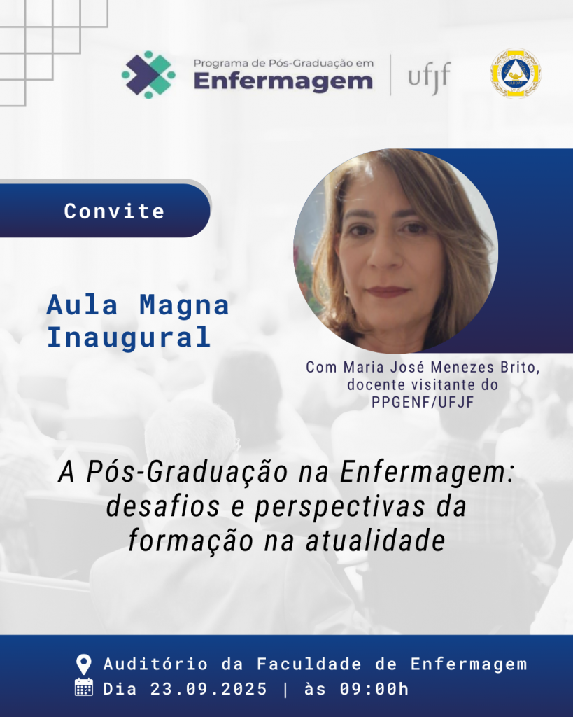 O PPGEnf UFJF convida toda comunidade acadêmica para a Aula Magna de abertura do semestre do Doutorado e Mestrado em Enfermagem, com a Profª Drª Maria José Menezes Brito, docente visitante do programa.