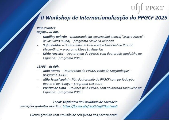 O Programa de Pós-graduação em Ciências Farmacêuticas (PPGCF) da UFJF realizará no mês de agosto a segunda edição do “Workshop de Internacionalização do PPGCF”, evento que tem por objetivo mostrar as experiências internacionais recentes em que os estudantes do PPGCF tiveram por diferentes programas de intercâmbio de pós-graduandos, como PDSE (doutorado sanduíche) da CAPES, GCUB (doutorado pleno no PPGCF), COFECUB (pós-doutorado no exterior) e Move La America (doutorando sanduíche no PPGCF), incentivando, assim, outros alunos do PPGCF a participarem de oportunidades de intercâmbio.