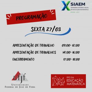 O Seminário Interno Anual em Educação Matemática (SIAEM) é promovido pelo Programa de Pós-Graduação em Educação Matemática da Universidade Federal de Juiz de Fora (PPGEM/UFJF) e configura-se como um dos espaços estruturantes da formação e da vida acadêmica do programa. Tradicionalmente realizado no início das atividades acadêmicas, o seminário reúne docentes, discentes e egressos em torno das pesquisas desenvolvidas no campo da Educação Matemática.
