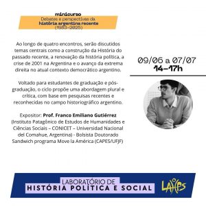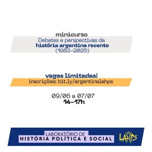 O Laboratório de História Política e Social (LAHPS) da Universidade Federal de Juiz de Fora convida para o ciclo “Debates e perspectivas da história argentina recente (1983-2025)”, um espaço de reflexão crítica sobre alguns dos principais debates e tópicos da historiografia argentina contemporânea.