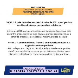 Ao longo de quatro encontros, serão discutidos temas centrais como a construção da História do passado recente, a renovação da história política, a crise de 2001 na Argentina e o avanço da extrema direita no atual contexto democrático argentino.