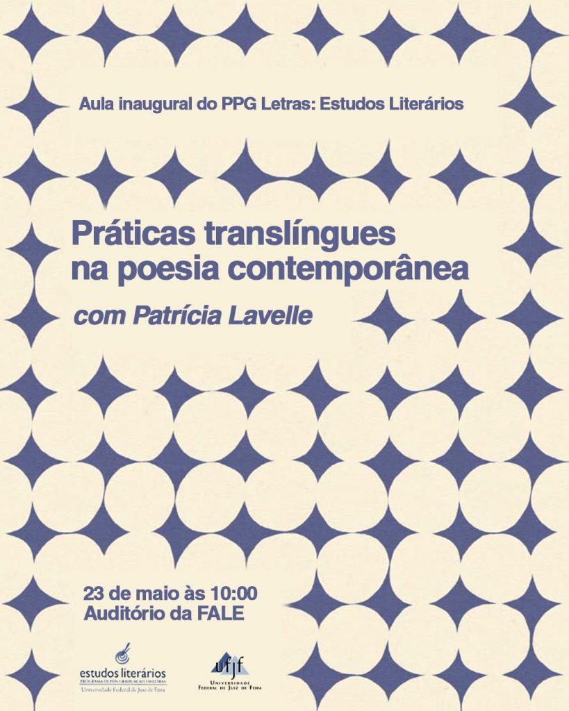 O Programa de Pós-Graduação em Letras: Estudos Literários convida toda a comunidade acadêmica para a aula inaugural “Práticas translíngues na poesia contemporânea“, a ser ministrada no Auditório da Faculdade de Letras, no dia 23 de maio de 2025 (sexta-feira), às 10h, pela Profa. Dra. Patrícia Lavelle (PUC-Rio / CNPq).