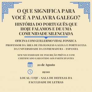 A Faculdade de Letras da UFJF convida todos e todas para a oficina com Guillermo Vidal Fonseca, professor da área de Filologias Galega e Portuguesa da Universidade da Estremadura – Espanha.
