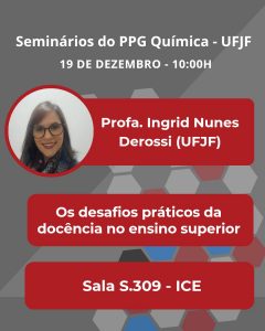 O Programa de Pós-Graduação em Química convida a todos(as) para o seminário da Profa. Dra. Ingrid Nunes Derossi (UFJF), intitulado “Os Desafios Práticos da Docência no Ensino Superior”, que ocorrerá no dia 19/12 (sexta-feira), às 10h00, na sala S 309 do ICE. A Profa. Ingrid é egressa nossa e chegou recentemente para compor nosso corpo docente.