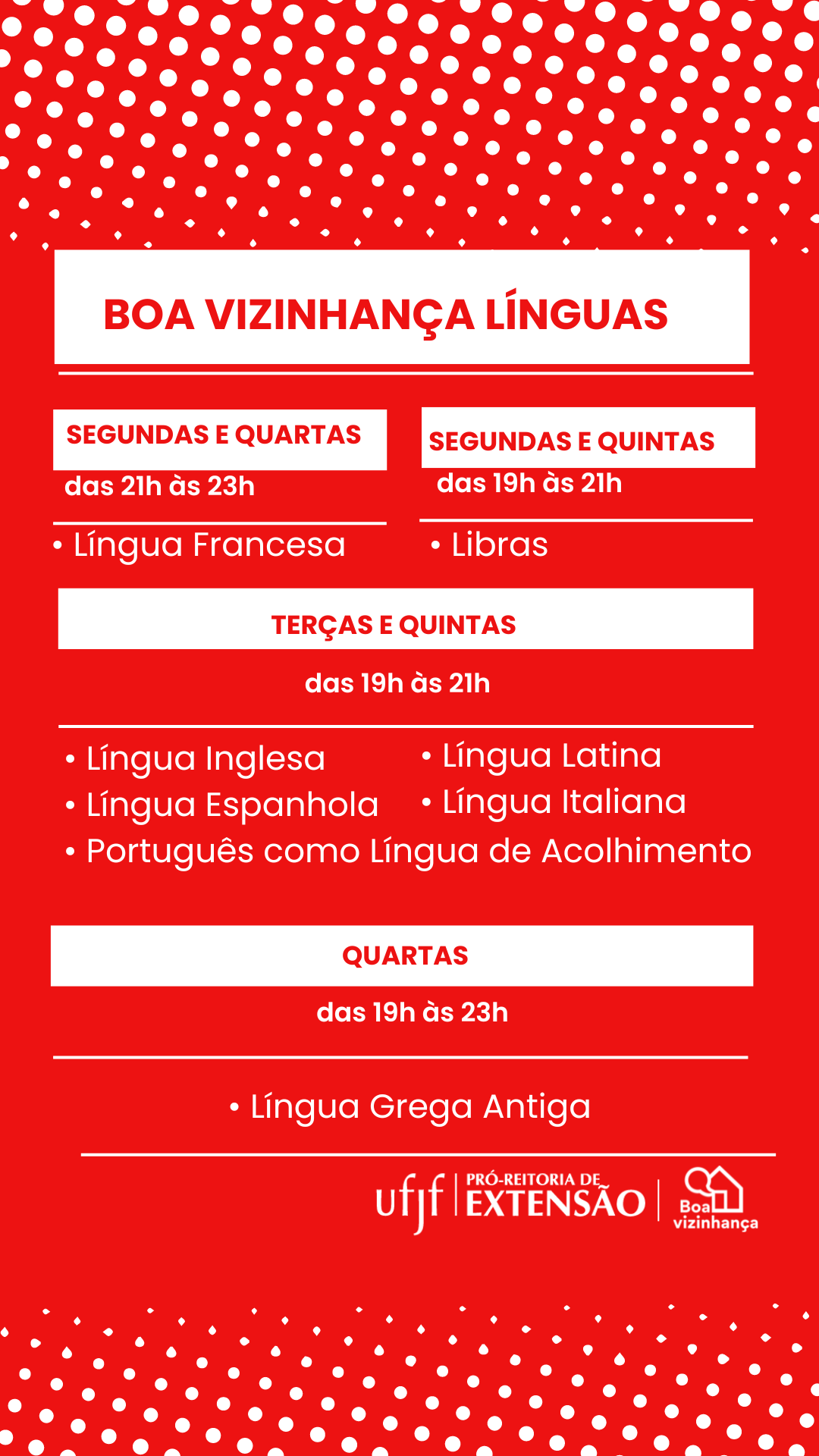 A Pró-Reitoria de Extensão (PROEX) publicou nesta terça-feira (14) o resultado do sorteio dos candidatos inscritos para os oito cursos oferecidos pelo Programa Boa Vizinhança – Línguas para o primeiro semestre de 2023. A listagem dos candidatos selecionados e a lista de espera podem ser acessadas AQUI.