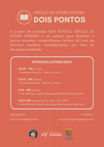 O projeto de extensão Dois Pontos: Círculo de Leitura Literária, promovido pela Pró-Reitoria de Extensão da UFJF em parceria com o CAp. João XXIII e o PROFLETRAS, está com inscrições abertas.