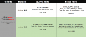 • 08h às 12h – Texto e Ensino – Profa. Dra. Daniela da Silva Vieira (Sala 2002)