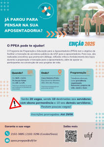 As inscrições para a edição 2025 do Programa de Preparação e Educação para a Aposentadoria (PPEA) da UFJF foram prorrogadas até o dia 29 de agosto. Como ainda restam poucas vagas, a expectativa é incentivar a participação de servidores(as) de diferentes setores, ampliando a diversidade do grupo e enriquecendo as trocas de experiências.