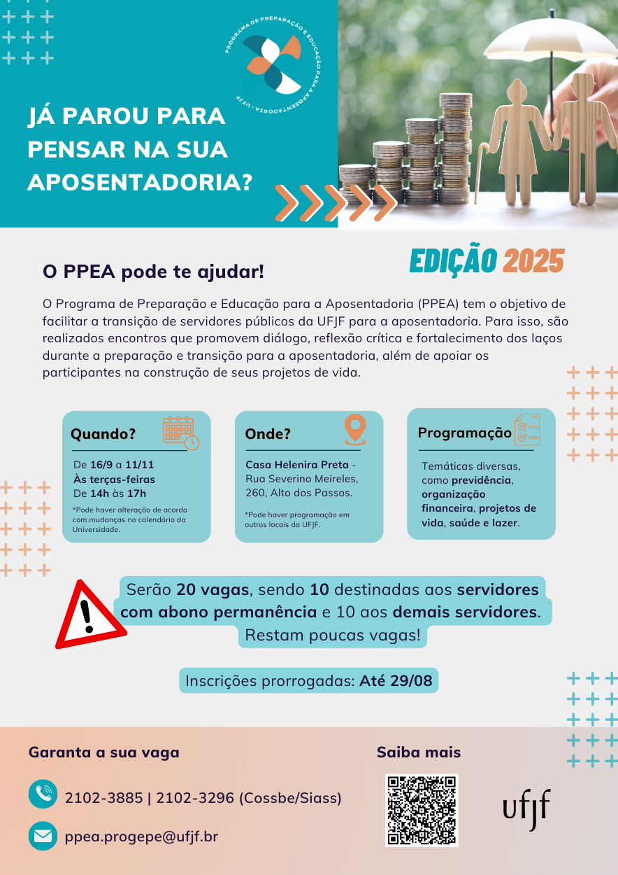 As inscrições são gratuitas e devem ser feitas pelo e-mail ppea.progepe@ufjf.br ou pelos telefones (32) 2102-3296 / 2102-3885. O preenchimento é feito por ordem de inscrição. O PPEA é voltado a servidores(as) que desejam refletir sobre a transição para a aposentadoria, incentivando o autoconhecimento, o planejamento de futuro e a construção de novos projetos de vida. O programa oferece, no total, 20 vagas.