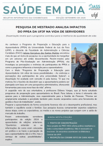 A Coordenação de Saúde, Segurança e Bem-Estar (COSSBE/SIASS) acaba de lançar a edição de setembro do informativo Saúde em Dia. O boletim reúne iniciativas voltadas ao bem-estar e à qualidade de vida da comunidade acadêmica da UFJF, além de atualizações sobre projetos em andamento.