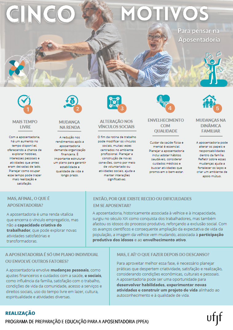 O Programa de Preparação e Educação para a Aposentadoria (PPEA) tem o objetivo de facilitar a transição de servidores públicos da UFJF para a aposentadoria. Para isso, são realizados encontros que promovem diálogo, reflexão crítica e fortalecimento dos laços durante a preparação e transição para a aposentadoria, além de apoiar os participantes na construção de seus projetos de vida.