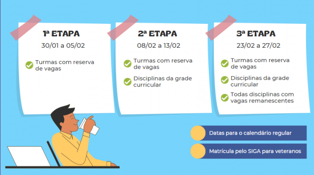 Na segunda etapa, de 8 a 13 de fevereiro, além de poder se matricular nas disciplinas com reserva de vagas para aquela turma, os alunos podem também fazer o pedido por outras disciplinas de sua grade curricular. E na terceira, de 23 a 27 de fevereiro, ficam disponíveis, além das disciplinas da grade, as matérias com vagas remanescentes de todos os cursos da Universidade. Esses são os prazos do calendário regular, que inicia as aulas em 13 de março. Estudantes de cursos com calendários ainda em reposição devem se atentar aos seus respectivos prazos. O procedimento será o mesmo.