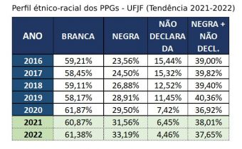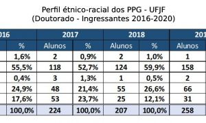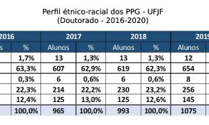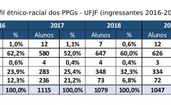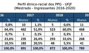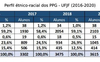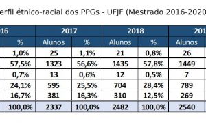 Motivada pelas discussões a respeito do sistema de cotas na Pós-graduação, a Pró-reitoria de Pós-graduação e Pesquisa (PROPP) torna públicas as informações disponíveis acerca do perfil étnico-racial dos mestrandos e doutorandos da UFJF. Além de dar transparência, o objetivo é subsidiar o desenvolvimento de uma política de ações afirmativas baseada em dados.