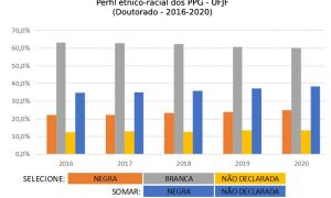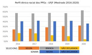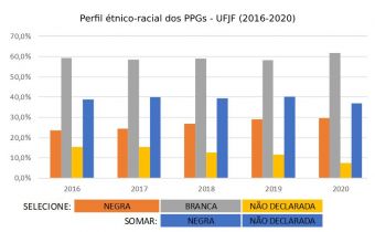 • UFJF – Para contornar a defasagem da informação, recorremos à autodeclaração que conta na base de dados da Instituição. Solicitamos os dados relacionados à raça/cor ao CGCO, e, a partir deles, cruzando a base com as informações da plataforma da CAPES, chegando a apenas 7,4% de não declarados no ano de 2020.