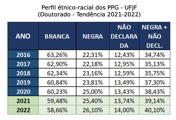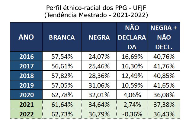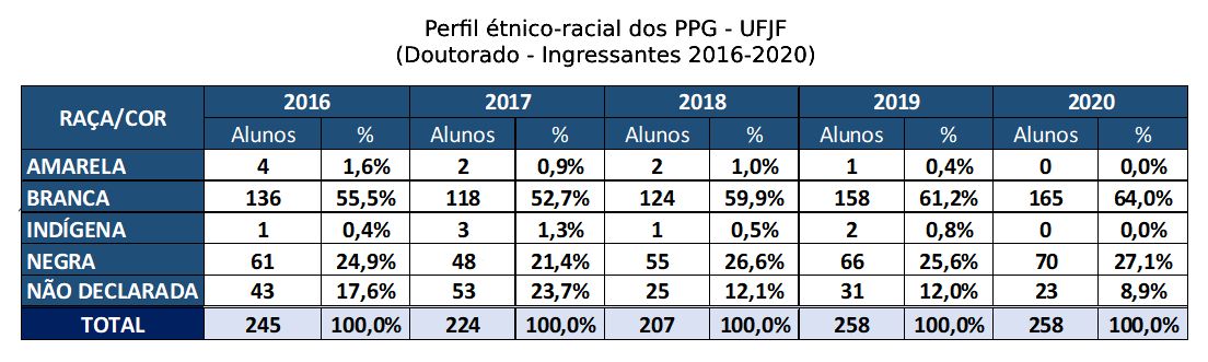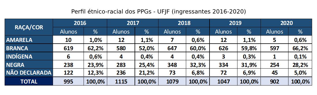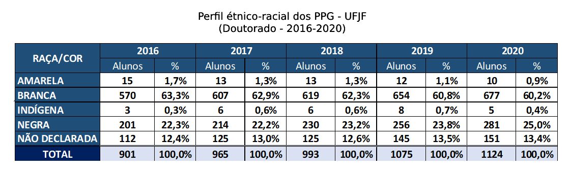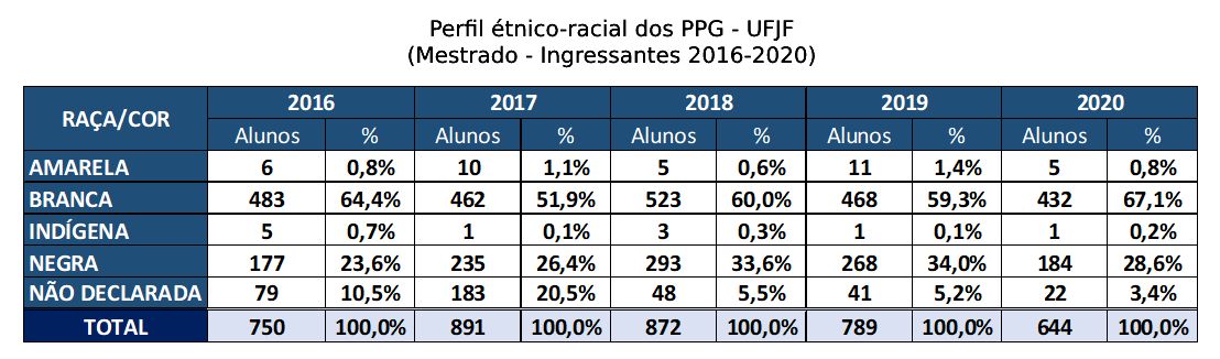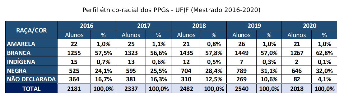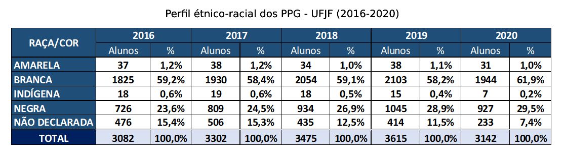Motivada pelas discussões a respeito do sistema de cotas na Pós-graduação, a Pró-reitoria de Pós-graduação e Pesquisa (PROPP) torna públicas as informações disponíveis acerca do perfil étnico-racial dos mestrandos e doutorandos da UFJF. Além de dar transparência, o objetivo é subsidiar o desenvolvimento de uma política de ações afirmativas baseada em dados.