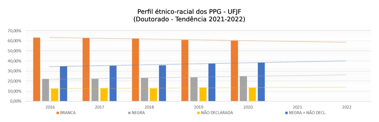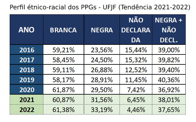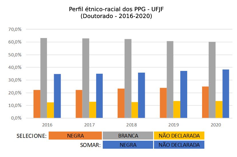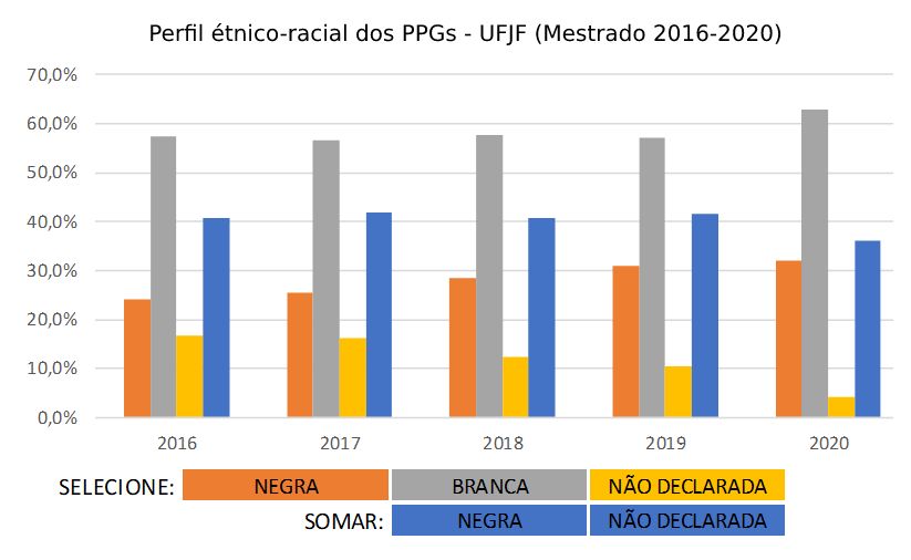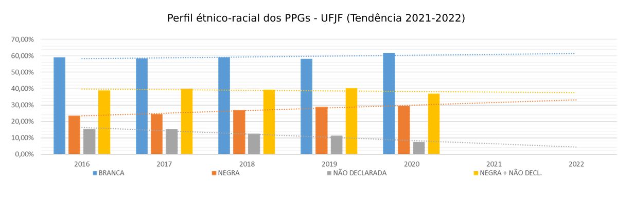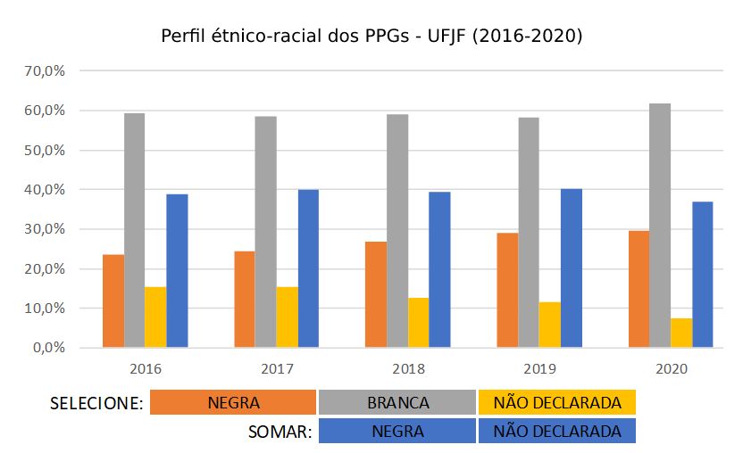 • UFJF – Para contornar a defasagem da informação, recorremos à autodeclaração que conta na base de dados da Instituição. Solicitamos os dados relacionados à raça/cor ao CGCO, e, a partir deles, cruzando a base com as informações da plataforma da CAPES, chegando a apenas 7,4% de não declarados no ano de 2020.