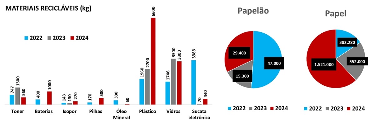 Os materiais recicláveis recolhidos pela Diretoria de Sustentabilidade e Patrimônio incluem papel e papelão, plástico, vidros, metais, pilhas, isopor e cartuchos de impressão. Dentre esses, o papel e papelão, os plásticos e as sucatas metálicas são destinados às associações de catadores, promovendo geração de renda e inclusão social.