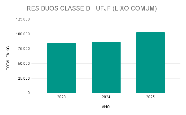 A partir de 2023, a Universidade Federal de Juiz de Fora (UFJF) passou a mensurar os resíduos da Classe D (lixo comum) com base no peso total gerado. Nesse ano, a média mensal foi de aproximadamente 6.400 kg, totalizando cerca de 84.750 kg no período.
