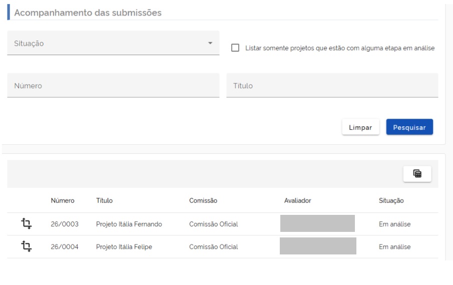 Como gestor da chamada, você pode acompanhar quais projetos foram submetidos para cada comissão, quem é o avaliador de cada projeto (em caso de avaliação às cegas) e qual a situação do projeto (Em análise, Rejeitado, Aceito).