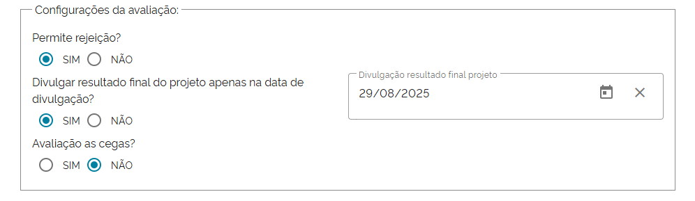 - na mesma tela você deverá configurar a avaliação e se o projeto permite ou não rejeição pela banca. Caso seja marcado não, no momento da avaliação não será possível dar um parecer “Rejeitado”.