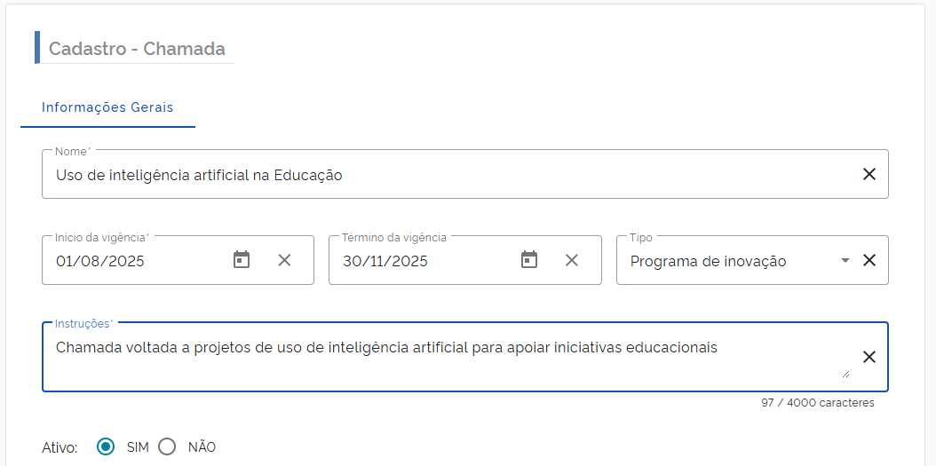 - Acesse o SIGAX e navegue no menu até Galeria de aplicações -> Projetos -> Chamada.