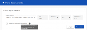 Uma opção “Remover as disciplinas aprovadas” foi acrescentada com a finalidade de retirar do grupo de resultados exibidos, as disciplinas contidas no histórico escolar do estuante que já tenham sido aproveitada(s), ou seja, foi aprovado, dispensado, usada em equivalência, etc.