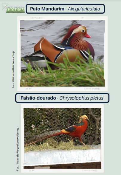 Dois exemplos da região asiática são o pato-mandarim e o faisão-dourado. Considerado o pato mais bonito do mundo, ocorrendo na China e Japão, o pato-mandarim (Aix galericulata), com todas suas cores e formas, parece até ter sido desenhado. Costumam ser encontrados em lagos arborizados, e voam com muita agilidade. Também da China, o faisão-dourado (Chrysolophus pictus) possui cores vivas, como roxo, vermelho e amarelo – de onde se inspira seu nome. Assim como em muitas outras espécies de aves, os machos são os mais coloridos, enquanto a fêmea apresenta a coloração marrom. Assim como nas danças mencionadas para as aves-do-paraíso, esse é mais um exemplo de seleção sexual, ou seja, as fêmeas escolhem os machos muitas vezes baseando-se em suas colorações chamativas.