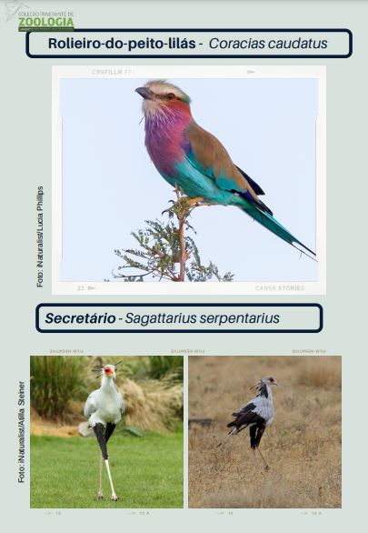 Dois exemplos da África incluem o rolieiro-do-peito-lilás e a ave secretária. O pássaro nacional do Quênia, na África Oriental, o rolieiro-do-peito-lilás (Coracias caudatus) possui cores completamente diferentes, e seu nome tem relação com seu típico voo nupcial, que é cheio de acrobacias. Podendo chegar a cerca de 1,35 m de altura, a Ave Secretária (Sagittarius serpentarius), é uma ave de rapina, e nativa da África. Apesar de toda sua elegância (ver na foto abaixo), são caçadoras de serpentes venenosas, de onde vem a segunda parte do seu nome (serpentarius).